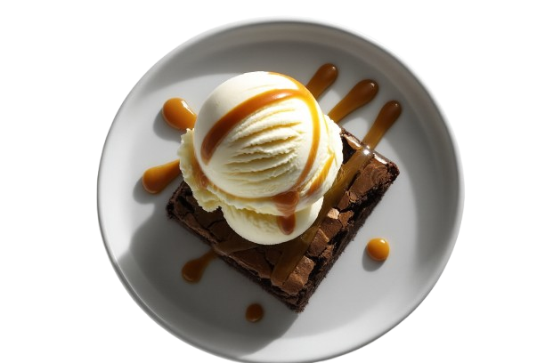 Warm, fudgy brownie topped with creamy ice cream and sweet caramel.